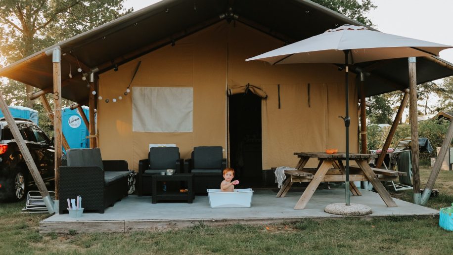 De verwarmde safaritenten met eigen sanitair zorgen voor een echt glamping gevoel! Een safaritent beschikt over een kacheltje voor de frissere dagen en een eigen toilet. De safaritenten staan vooraan op de camping op slechts 1,5 minuten lopen van allerlei belangrijke faciliteiten, zoals, het sanitairgebouw, zwembad, speeltuin, kidsclub en receptie. Een safaritent is 35 m2 groot excl. ruime veranda en geschikt voor 5 personen (+ eventueel een kind dat in een campingbedje slaapt). De safaritenten hebben een zeer gezellige afwerking met veel steigerhouten elementen.